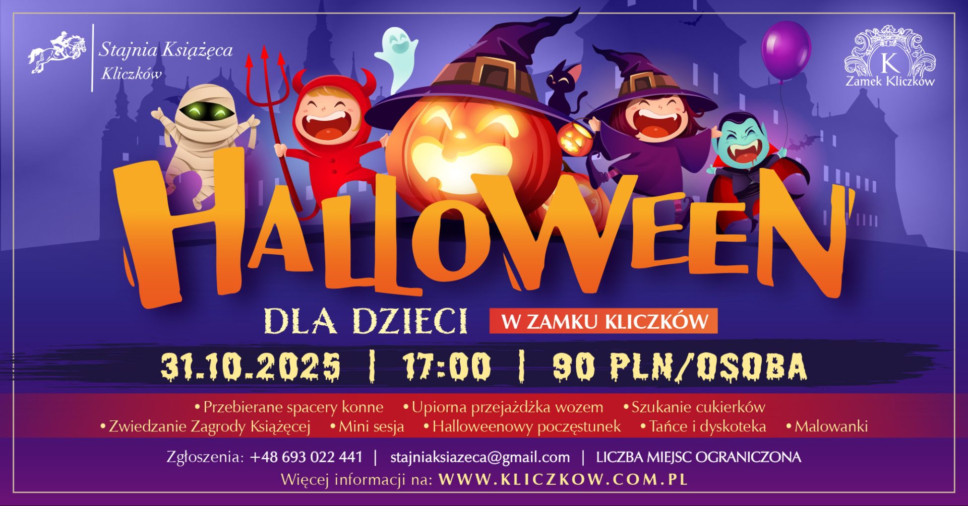 Serdecznie zapraszamy do Zamku Kliczków na Halloween dla dzieci. Impreza rozpocznie się w piątek 31.10.2025 w Zamku Kliczków o godzinie 17:00.
